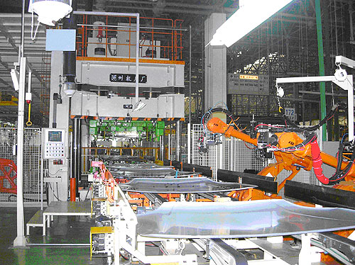 车门包边液压机是为汽车制造厂开发的专用液压机,具有速度快、自动化程度高、工作柔性化程度⾼等特点,广泛应用于于汽车车门的包边工艺。本系列液压机由主机和快速换模系统组成,快速换模系统采用具有自主知识产权的移动工作台模具置换装置,包括多只移动⼯作台的组合、换模小车、储模系统和模具快速夹紧系统、控制系统。公称压力:1500~5000KN